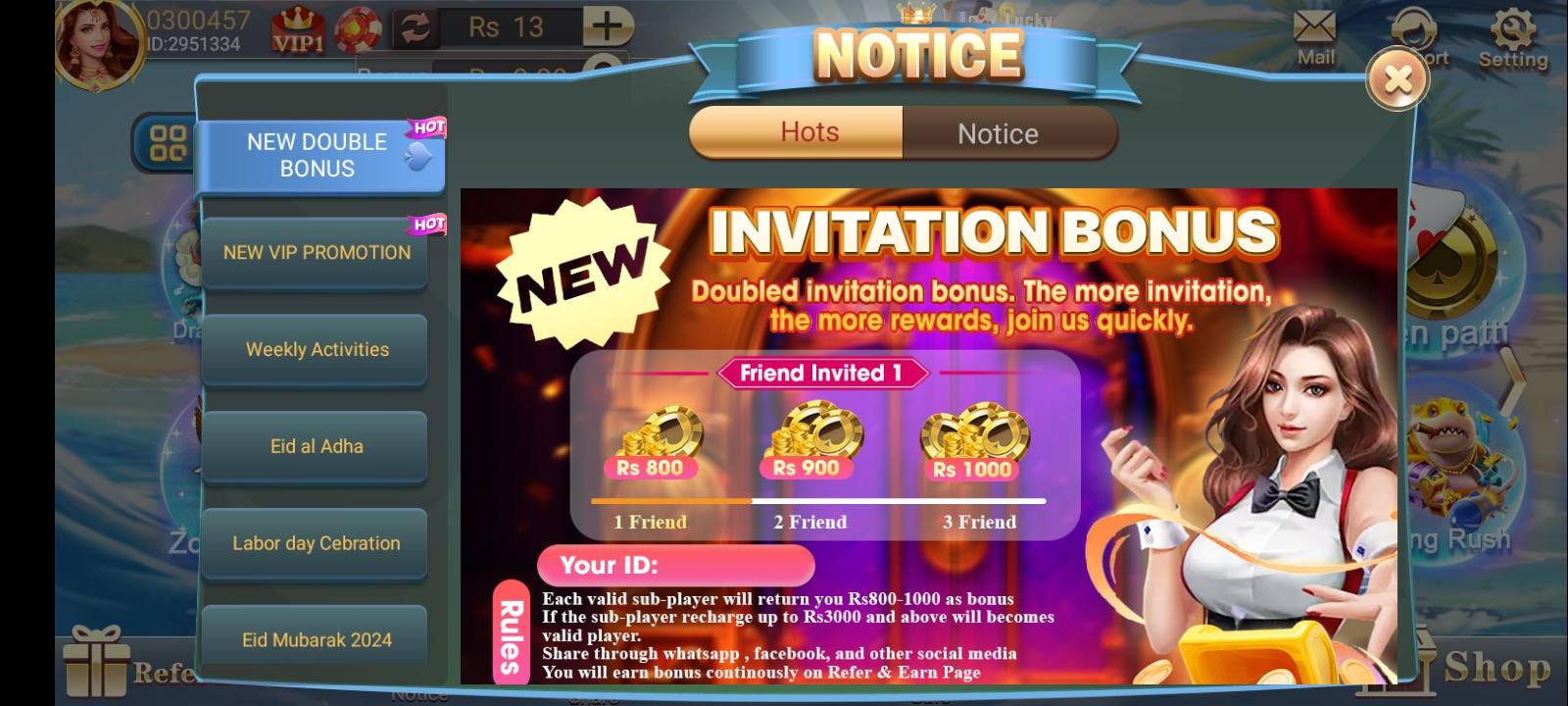 - Multiple Games: Teen Patti, Dragon vs Tiger, Poker, Rummy, Ludo, Andar Bahar, Mines, and more.